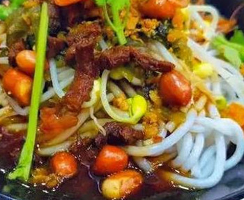 在粗粉中加進(jìn)滾熱的肉湯,撒上少許蔥花、爆花生米等,喜歡海鮮口味的,還會加蝦肉和海白。