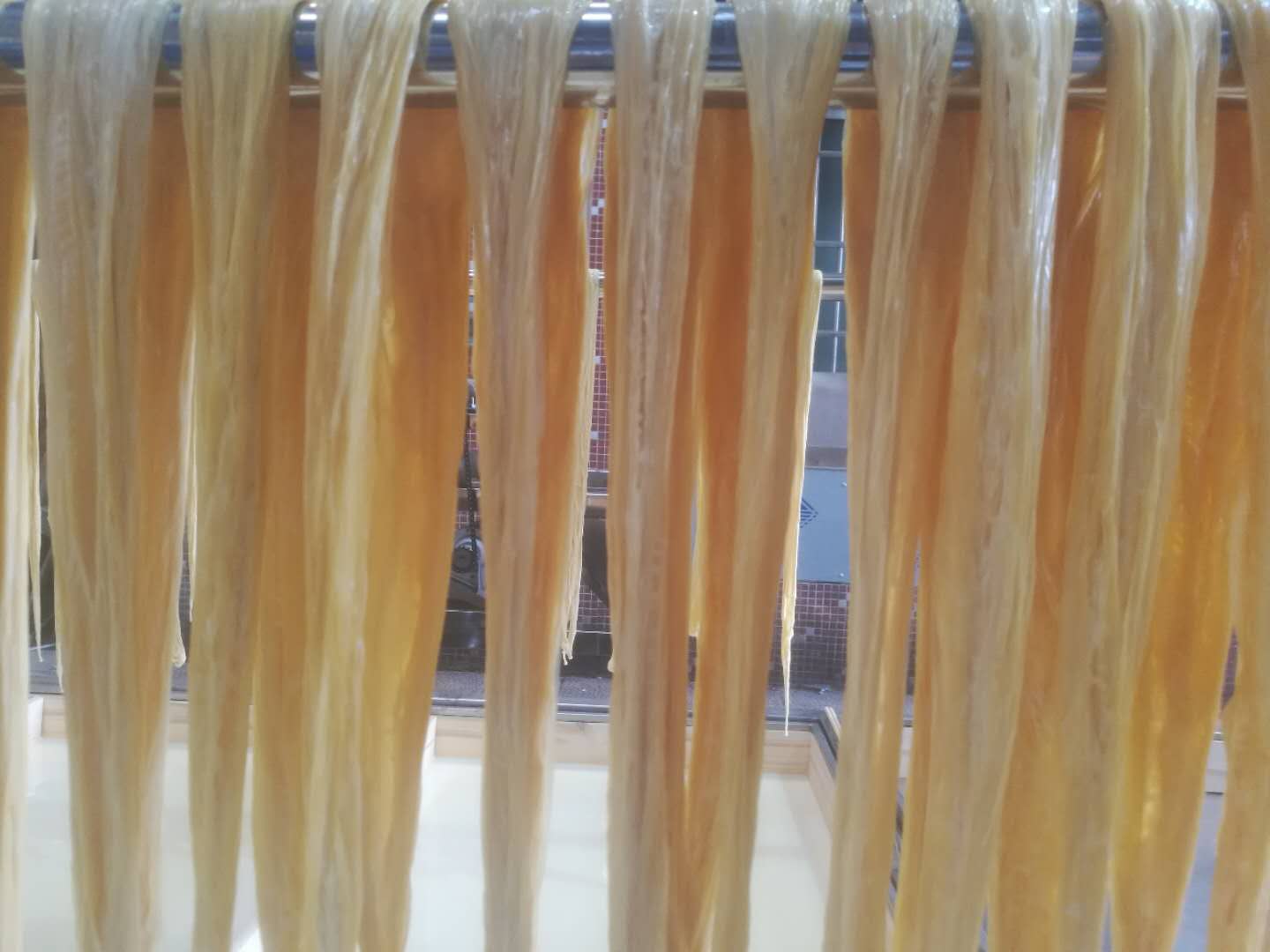 “一洗豆、二浸豆、三打漿、四隔渣、五擰漿、六煮漿、七鏟邊、八提膜、九掛灶、十曬晾”,遵照傳統(tǒng)古法,盡可能手工制作,還原腐竹本味。豆?jié){煮沸時(shí),上層凝固的部分成條的挑起來,晾干后就成了腐竹,用水泡開后就可以拿來烹飪了,吃著又鮮又滑,F(xiàn)在的人多數(shù)是用腐竹機(jī)來半自動(dòng)化制作腐竹,效率高。